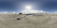 Aerial view of Miami Beach, Florida. The man on the skateboard rides at high speed on an elevated ramp, surrounded by buildings and open spaces. The sun shines on the straight road below.