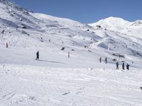 Experience the thrill of skiing in the magnificent French Alps. Enjoy the breathtaking mountain landscape, open spaces, and clear blue skies. This photo depicts a group of people skiing on a slope in the mountains, with one person standing near the snow. The snowy terrain and stunning cliff formations create a perfect backdrop for this tourist attraction. Discover the beauty of the glacial mountain range in France, a popular destination for winter sports enthusiasts. This image perfectly captures the essence of winter recreation in Europe.