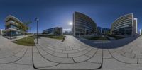 A panoramic view from a 360° camera lens captures the modern architecture and urban design of Lisbon, Portugal. Skyscrapers and high-rise buildings line the waterfront, creating a bustling cityscape. The clear sky and open spaces add to the vibrant atmosphere.