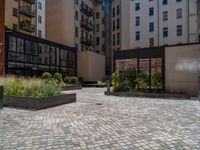 A modern urban courtyard in Berlin, Germany, showcasing sleek architecture and brick walls. Cobblestone surfaces blend with modern design in the city's business district. Residential and storage facilities complement the vibrant city life.