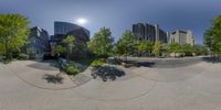 360 - degree photograph showing large building with many windows in the middle of the day