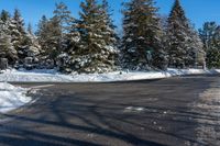 This stock photo features a snowy roadway in Toronto, Ontario, Canada. The asphalt surface has been cleared, and the road is lined with snow and trees on either side. The clear sky highlights the picturesque winter scene in this suburban area of Toronto. The image captures the open space and residential neighborhood ambiance of this suburban road during a snow-filled day in Ontario, Canada.