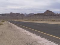 an empty road with yellow markings is in a desert area near power lines and telephone poles