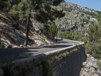 This image captures a scenic road in Mallorca, a beautiful island in the Balearic Islands of Spain. The road, made of smooth asphalt, winds through the mountains and offers a breathtaking view of the landscape. Tall trees and a rock wall line the sides of the road, adding to the natural beauty of the surroundings. The clear sky above enhances the overall beauty of the scene. This photo depicts a perfect day for a drive in Mallorca, showcasing the stunning nature and picturesque landscape of the island.