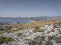 the hills are barren and filled with grass and shrubs on top of the rocks is the ocean