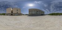 a fish eye view of some buildings on the ground with a ramp and ramp leading to it