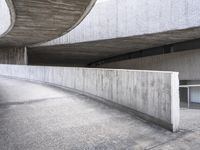 the long curved wall of a cement building next to a metal staircase with a railing