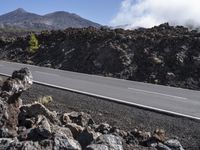 This is an image of a rugged mountain landscape in Tenerife, Spain. The clear sky provides a stunning backdrop to the highland terrain, featuring rocky cliffs and slopes. A road, made of asphalt, winds through the mountain pass, showcasing the infrastructure in this remote and wild wilderness. The elevated highway offers a breathtaking journey through the mountain range, surrounded by untouched nature. This photo represents the beautiful and adventurous landscapes of Tenerife, a highland paradise in Europe.