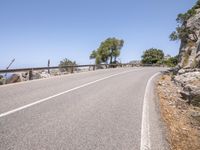 A picturesque road in Mallorca, Spain. The asphalt lane winds through a stunning landscape, lined with trees and rocks. The clear sky overhead adds to the beauty of the Balearic Islands.