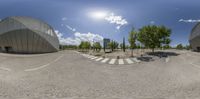 A futuristic architecture in Zaragoza, Spain. The modern metal walls and concrete streets create a sleek urban landscape. The hard shadows and straight road lead to a zebra crossing, adding a touch of European charm.