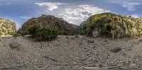 Majestic Majorca landscape with a rocky wall and open space leading to a canyon. Clear skies with shadows casting over the European dirt and gravel surface. Aerial view of coastal Balearic Islands.