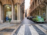 A vibrant street in Mallorca, Spain, with classic architecture and busy shops. The bustling art district offers a glimpse into the urban charm of this European city. Straight down the road, people walk past storefronts and parked cars.
