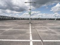 A modern urban landscape in Berlin, Germany. An empty parking lot with numerous traffic signs and streetlights. The clear sky and clouds create a dramatic backdrop to the city's modern architecture and urban design.