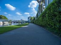 A straight road in Berlin, with modern architecture and urban design. The city's greenery and grass surfaces are contrasted by the hard shadows cast by the buildings. The river and pier add to the city's vibrant urban life.