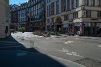 A classic city street in Strasbourg, France. Clear blue sky casts hard shadows on the urban architecture. Restaurants and storefronts line the road, inviting people to eat out and shop. Strasbourg's unique urban design on display.