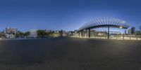 A fish eye lens captures a dynamic street scene in front of a city skyline. Modern and classic architecture blend together in a bustling urban setting. Clear skies and vibrant vegetation add to the lively cityscape.