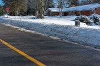 A residential street in suburban Ontario covered in snow. The road surface is visible beneath the snow, contrasting with the clear sky. A typical winter day in suburban Toronto, Canada.