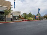 A suburban street scene with empty parking spaces and flags on both sides. The road surface is lined with trees, buildings, and storefronts. A clear sky adds to the pleasant daytime atmosphere.
