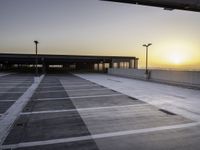 This is an image of an empty parking lot at sunset, with buildings and light poles in the background. The asphalt road surface reflects the warm sunlight, creating a beautiful contrast with the clouds in the sky. The architecture of the surrounding buildings adds an element of urban charm to the scene. This photo captures the peacefulness of an evening in the city, with the street lights starting to shine. The combination of the empty parking lot and the buildings in the distance creates a sense of space and tranquility.