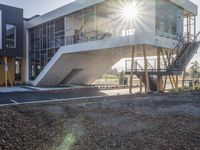 This is an image of a modern residential building in the bustling city of Los Angeles, California, USA. The architectural design features a mix of residential and commercial properties, with a prominent office building in the background. The sun shines bright in the clear sky, reflecting off the sleek facade of the building. A concrete road and a driveway lead to the entrance of the building, with stairs providing access. The image captures the vibrant and sunny city life of Los Angeles, showcasing the urban design and real estate opportunities in the area.