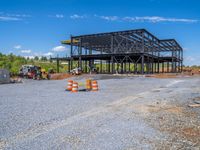 A sunny day at a construction site in the USA. Open spaces and clear skies surround the building under construction. Gravel and dirt surfaces cover the off-road tracks leading to the steel structure.