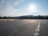 This image captures a sunny day in Berlin, Germany. The clear sky and sunlight illuminate the urban landscape, with a man riding a skateboard down an empty parking lot in front of a building. The open space and asphalt roads contribute to the city's urban design. The surrounding nature, including trees and grass, provides a refreshing contrast to the urban environment. With its vibrant atmosphere and European charm, Berlin is a city that seamlessly blends nature and city life.