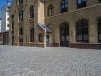 A sunny day in Berlin's urban business district. Cobblestone streets contrast with modern office buildings and brick walls. An open courtyard in Europe's warehouse cityscape, showcasing urban design with clear skies.