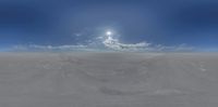 A sunny day highlights the vastness of salt flats under a clear sky. Endless expanse creates an environment of open space, with sun visible and no clouds in sight.