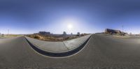an angle view of the sun as seen from a ramp in a parking lot with a dirt road and mountains in the background