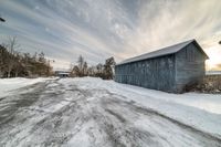a barn sitting next to a parking lot covered in snow and snow drifters on the street