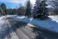 Snow-covered road in a suburban area of Toronto, Ontario. Evergreen trees line the roadway, with the sun shining brightly on a sunny winter day. A picturesque scene in Canada.