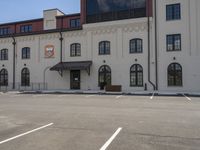the building in front of it has parking spaces on both sides of the street and is surrounded by parking spaces