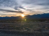 a photo of a sunset over some mountains and water with the sun in the middle of the day