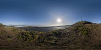A breathtaking view of the San Francisco skyline at sunset, overlooking the coastal highway. The sun casts a warm light on the natural landscape, while the clear sky stretches over the ocean. A serene and picturesque scene.