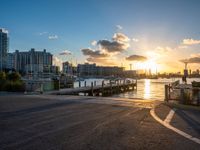 This stunning stock photo shows a pier with boats on water during sunset time in Miami, Florida. The cityscape area of Miami Beach is visible in the background, creating a beautiful coastal landscape. The sun is visible on the water's surface, making the scene even more captivating. The photo captures the urban design and natural beauty of this coastal city, showcasing its vibrant atmosphere. This image is perfect for illustrating the sunny and relaxing vibes of Miami, USA.