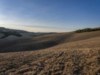This stunning stock photo captures a beautiful day in the hills of Tuscany, Italy. The clear sky and abundant sunshine illuminate the rugged mountain landforms, open grassy fields, and lush green trees. The image showcases the natural beauty of the European countryside, with its vast open spaces and unspoiled wilderness. In the foreground, you can see someone walking on the fallen grass surface and enjoying the serene atmosphere. The scenic view offers a sense of peace and tranquility, making it an ideal representation of nature, agriculture, and rural life in Tuscany. This image perfectly encapsulates the harmony between the sun, the land, and the people who work in this bountiful land.