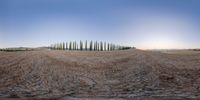 A surreal landscape in Tuscany, Italy at dawn. The straight road leads to an open space surrounded by cypress trees. The rugged terrain and clear sky create a mesmerizing view. A perfect harmony of nature and rural charm.