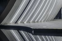 white curved structure with reflective glass underneath it in a dark area filled with water at night