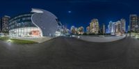 A view of Taichung cityscape at night, with the iconic fish-shaped building standing out in the modern architecture. The city comes alive with artificial lights, reflecting on the concrete and asphalt surfaces. A perfect urban design for shopping and city life.