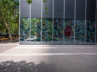 a reflection of a building on the glass wall of a large courtyard, with a red fire hydrant next to the building