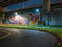 a wall with a colorful mural on it next to an empty road near grass and trees