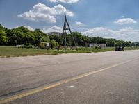 A clear sky over Tempelhof, Berlin's urban open space. Roads and asphalt connect recreational areas, while trees and vegetation create a natural landscape. The art district and airport add to the unique urban design of the city.