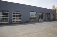 Grey building in the Tennessee countryside with fire station doors. Road to the right leads to urban Bristol. Industrial facade combines metal surfaces and warehouse windows. An iconic real estate property in Tennessee.