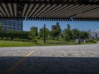Modern architecture in Tokyo's business district. Office buildings and open spaces create a dynamic urban design. Clear skies cast hard shadows on the paved surfaces. The hustle and bustle of city life in Japan.