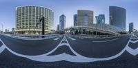a long curved road with white street marking and high buildings in the background in a city