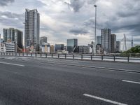 Tokyo's urban cityscape at dawn, featuring modern architecture and bridges. Grey sky backdrop contrasts with the asphalt roads and Armco barriers. A glimpse of Japan's urban skyline.