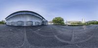 A 360-view of Tokyo's urban landscape, featuring a circular building against a clear blue sky. Shadows cast by trees add depth to the scene. The open space and straight roads showcase the city's urban design.