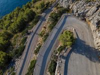 An elevated aerial view of a coastal road in Mallorca, Balearic Islands. The road winds through the stunning landscape, offering breathtaking views of the clear sky and the open space of the ocean. A top-down perspective showcases the high curves of this scenic route in Europe.
