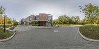 A panoramic view of a tree-lined street in Toronto's business district. The building in the background features an arched entrance and modern architecture. Clear skies and sunlight illuminate the urban landscape.