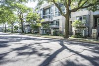 This stock photo showcases a modern architecture building in Toronto, Canada. The image features an empty street lined with trees and a building on a beautiful sunny day. The residential apartment building blends seamlessly into the suburban neighborhood, creating a harmonious and aesthetically pleasing atmosphere. The well-designed public space, asphalt road, and neatly maintained tree-lined curb add to the charm of the urban setting. This image perfectly captures the essence of city life in Toronto, Ontario, offering a glimpse into the thriving urban design and real estate scene in this bustling Canadian city.